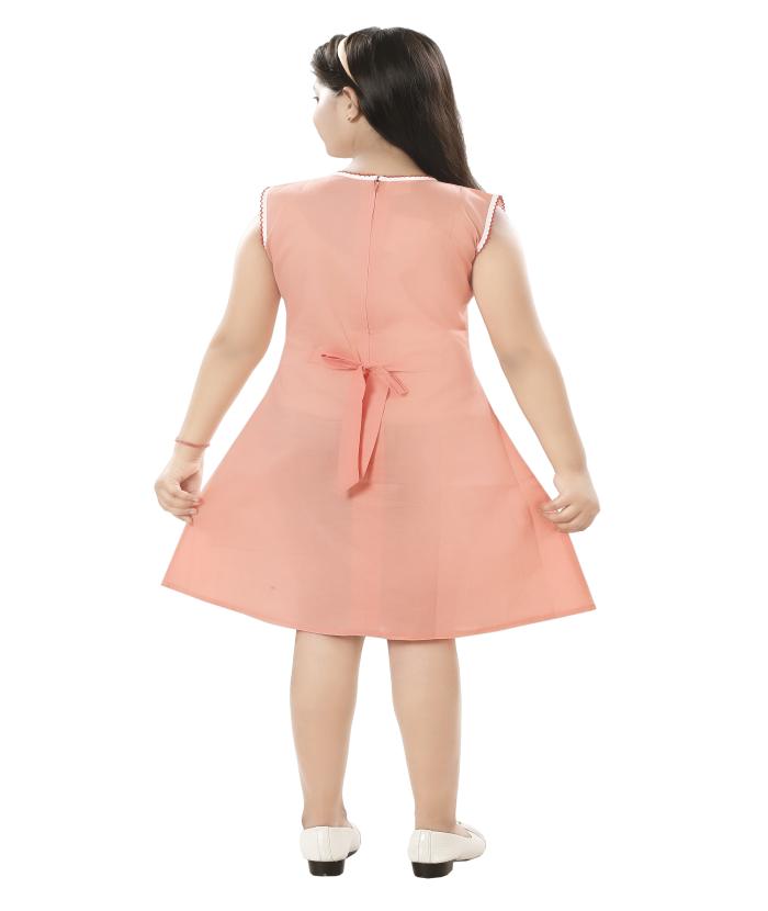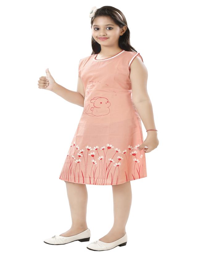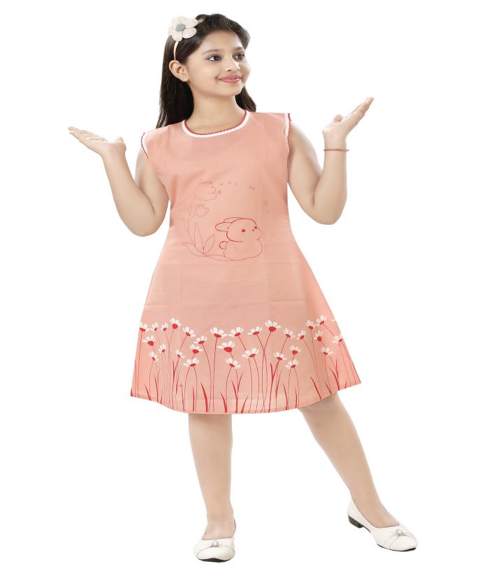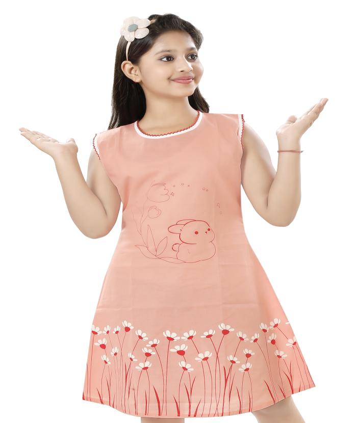 This adorable peach-colored cotton dress is a perfect blend of style, comfort, and charm! Featuring a playful bunny and tulip print along with a floral border design, this sleeveless frock is made from soft, breathable cotton to keep your little one cool and comfy throughout the day. It’s ideal for summer wear, birthday parties, playdates, or even casual outings.