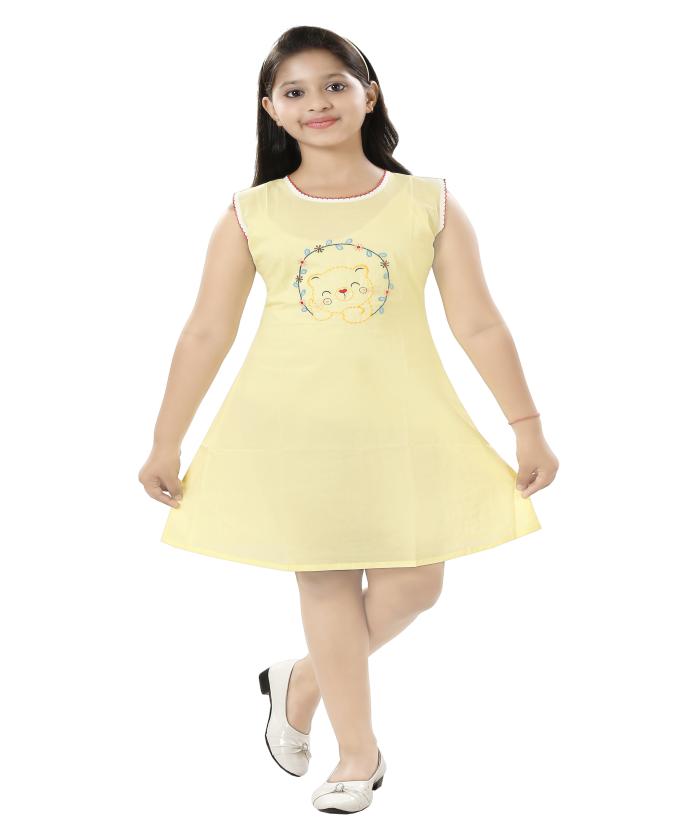 Soft & Breathable Cotton – Made from premium-quality cotton fabric for ultimate comfort, perfect for warm days. Cute Teddy Bear Embroidery – Adorable and colorful teddy bear design adds a fun and playful touch. Flattering A-Line Fit – Flowy and lightweight design ensures easy movement and a stylish appearance. Easy to Wash & Maintain – Machine washable, colorfast fabric that retains softness after multiple washes. Perfect for All Occasions – Ideal for playdates, casual outings, birthdays, and summer vacations.